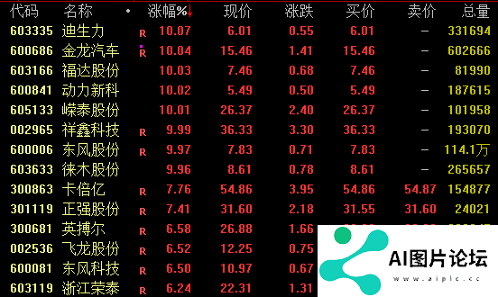 汽车产业链股盘中强势上扬,截至收盘,迪生力、金龙汽车、福达股份、动力新科、嵘泰股份、祥鑫科技、东风股份等涨停,卡倍亿涨近8%。